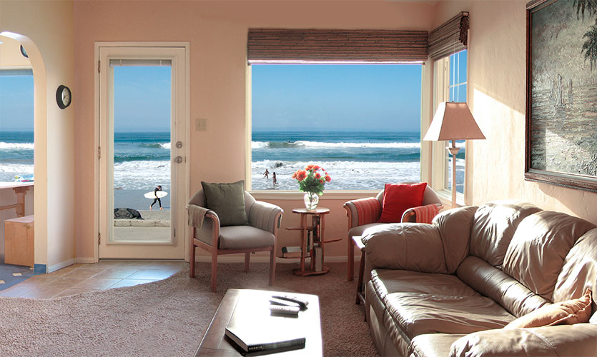 Enjoy hundreds of television channels in Aurora’s comfy living room, or turn to the right and see the real show: sunset over the Pacific.